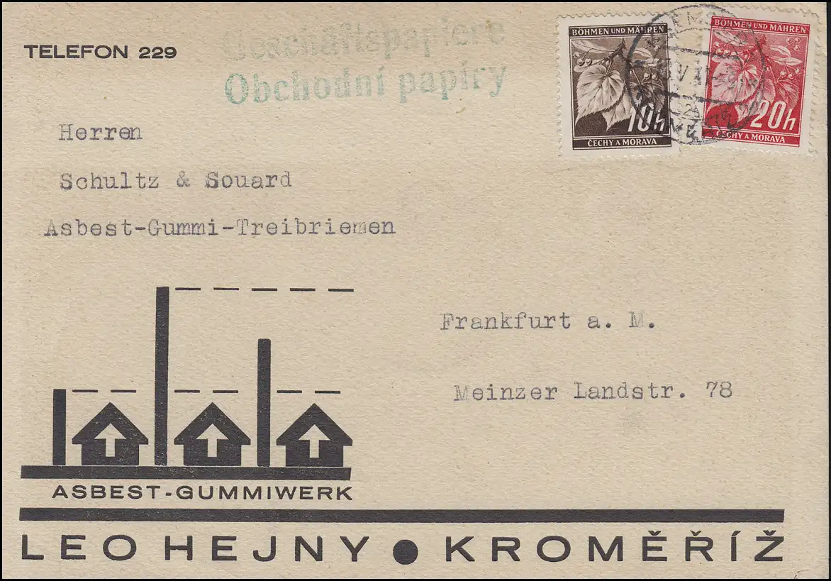 21+22 Lindenzweig-MiF auf Karte Asbest-Gummiwerk KREMSIER / KROMERIZ 13.5.41