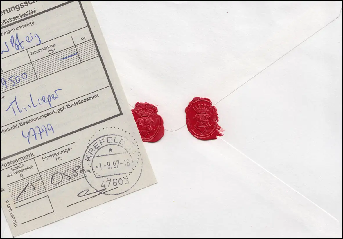 Portogerechte Einzelfrankatur zu 70,10 DM erstmalig am 1.9.1997 verwendbar für eigenhändigen Wert-Brief 19500 DM, rückseitig versiegelt