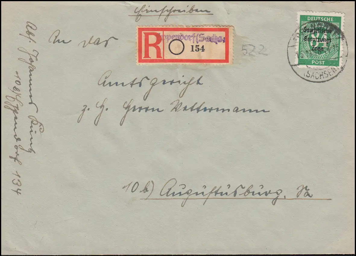 211 SBZ-Aufdruck 84 Pf. EF auf R-Brief Not-R-Zettel EPPENDORF/SACHEN 15.11.1948