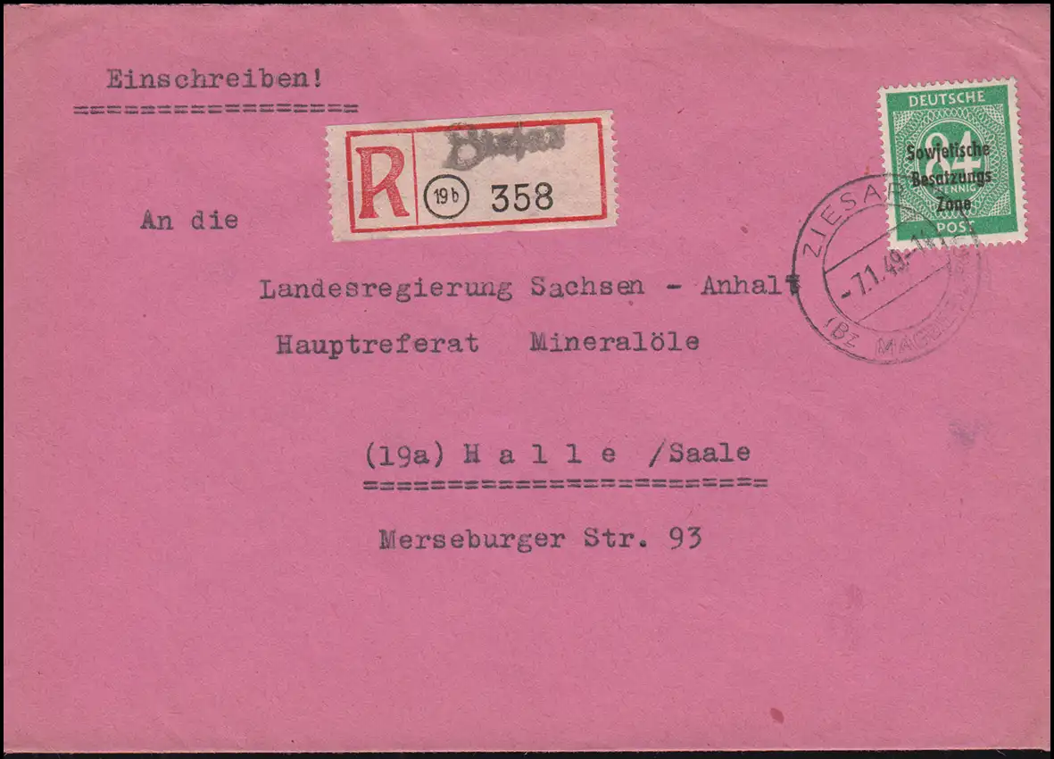 211 SBZ-Aufdruck als EF auf R-Brief Not-R-Zettel ZIESAR (Bz. MAGDEBURG) 7.1.1949