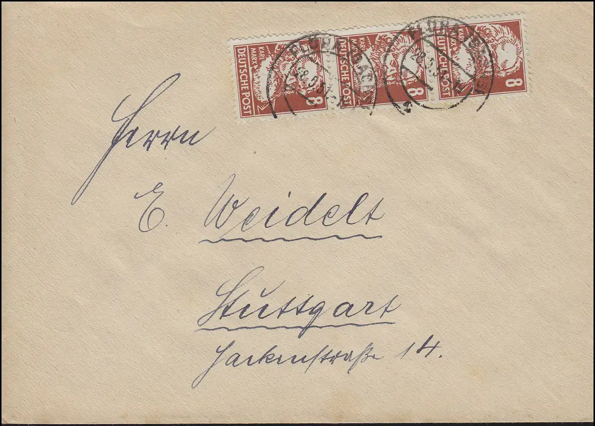 214 Karl Marx senkr. 3er-Streifen MeF Brief FLÖHA (SACHSEN) 28.5.51 n. Stuttgart