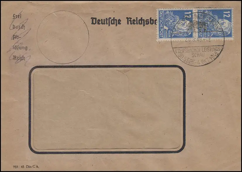 Fensterbriefumschlag mit Vordruck "Deutsche Reichsbahn" laut Abbildung.