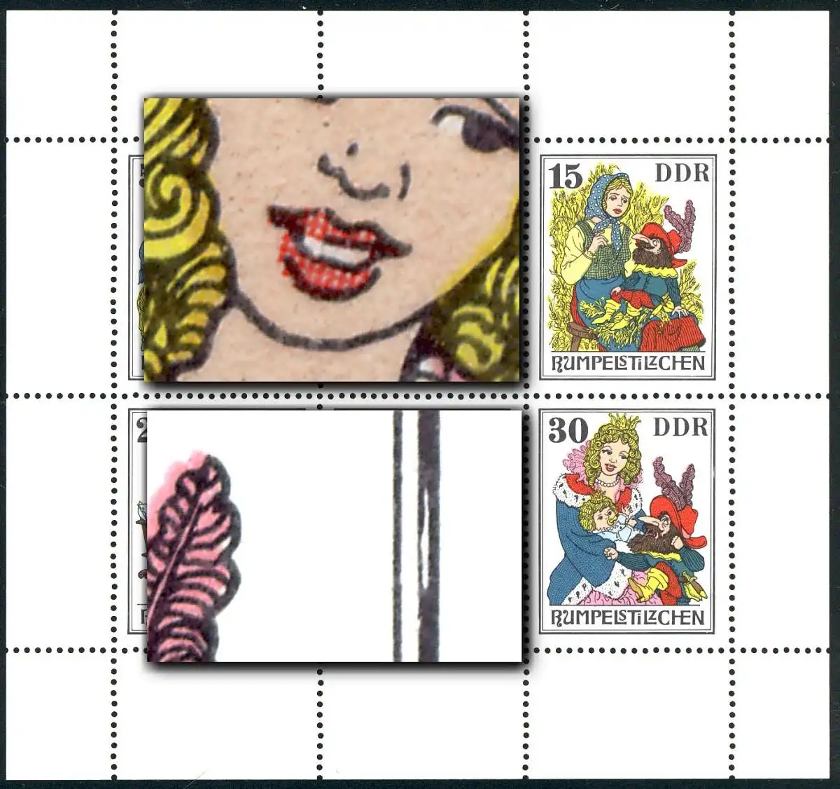 Rumpelstilzchen Märchen-Kleinbogen, Plattenfehler auf dem 30-Pfennig-Ert (2192): Bruch der Oberlippe und Rahmenstrich, Feld 6