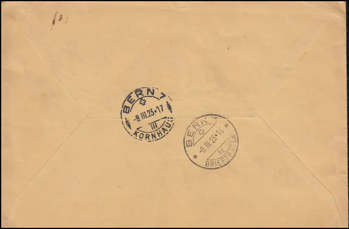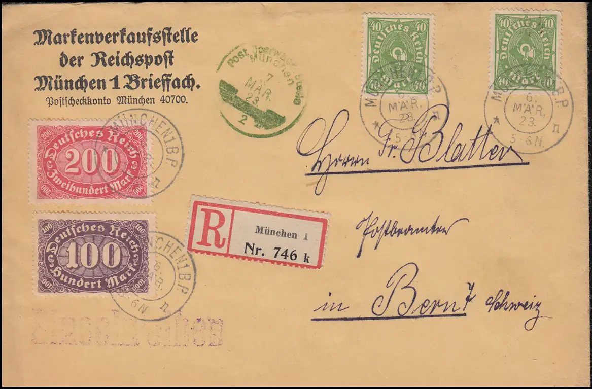 Lieferung der Briefmarkenversandstelle der Reichspost in München, grüner Briefstempel POSTÜBERWACHUNGSSTELLE MÜNCHEN 7.3.23. Portogerechte Mischfrankatur auf R-Brief in die Schweiz, Ankunftsstempel BERN KORNHAUS 8.3.23.