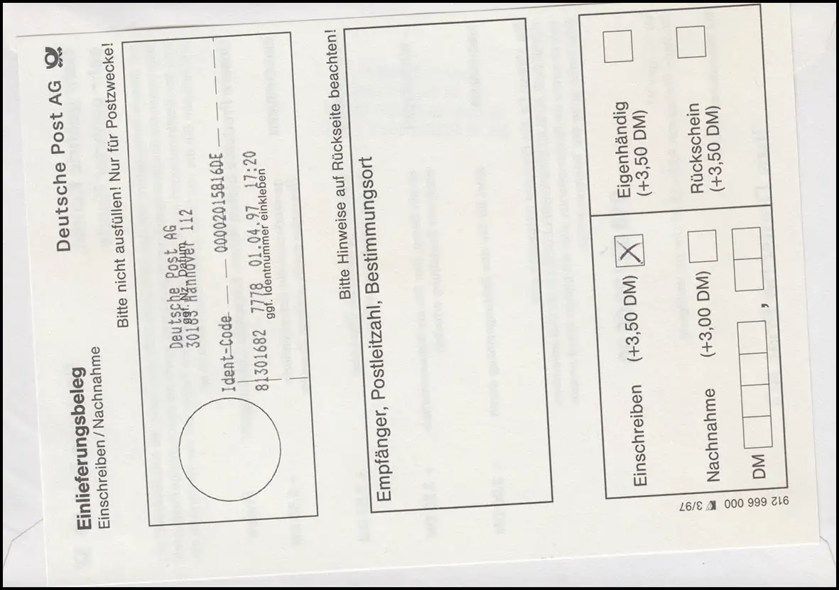 Ersttag für selbstklebende Label Zusatzleistungen mit Strichcode: R-Nummer mit Strichcode (für Einschreiben, Eigenhändig, Nachnahme und Rückschein). - Hier unterer Strichcodeteil nicht abgetrennt. Mit Einlieferungsbeleg (alt: Einlieferungsschein). Ersttagsbrief codiert.