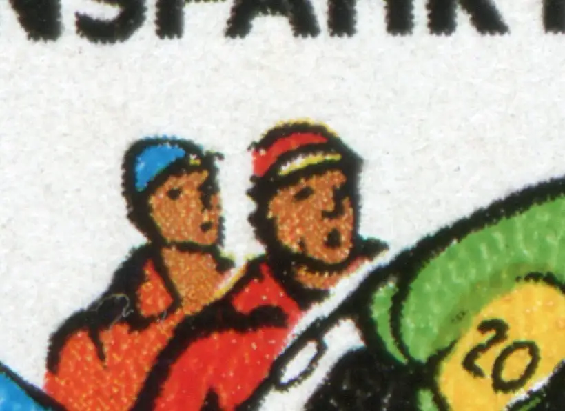 Plattenfehler auf dem 10-Pfennig-Wert: rote Mütze des rechten Mannes links defekt