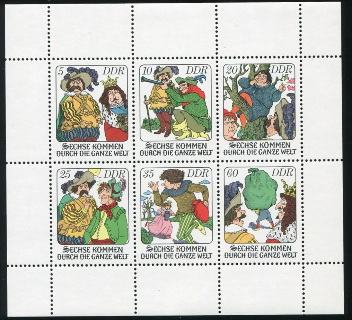 Sechse kommen durch die ganze Welt, Kleinbogen unten durchgezähnt mit Plattenfehler auf dem 35-Pfennig-Wert: blauer Fleck links an der Krone der Königstochter, Feld 4 [Richter 10 A III]