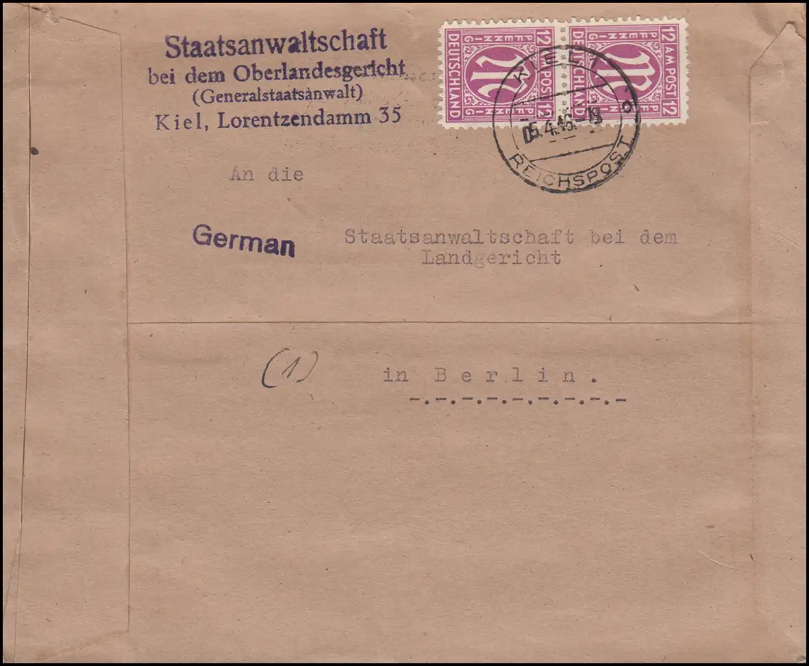 23 AM-Post MeF auf Brief Staatsanwaltschaft KIEL REICHSPOST 5.4.46 nach Berlin