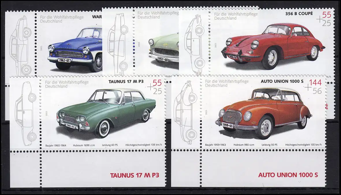 Wartburg, Olympia Rekord, Porsche, Taunus, Auto Union - alle mit Typenbezeichnung auf dem Bogenrand