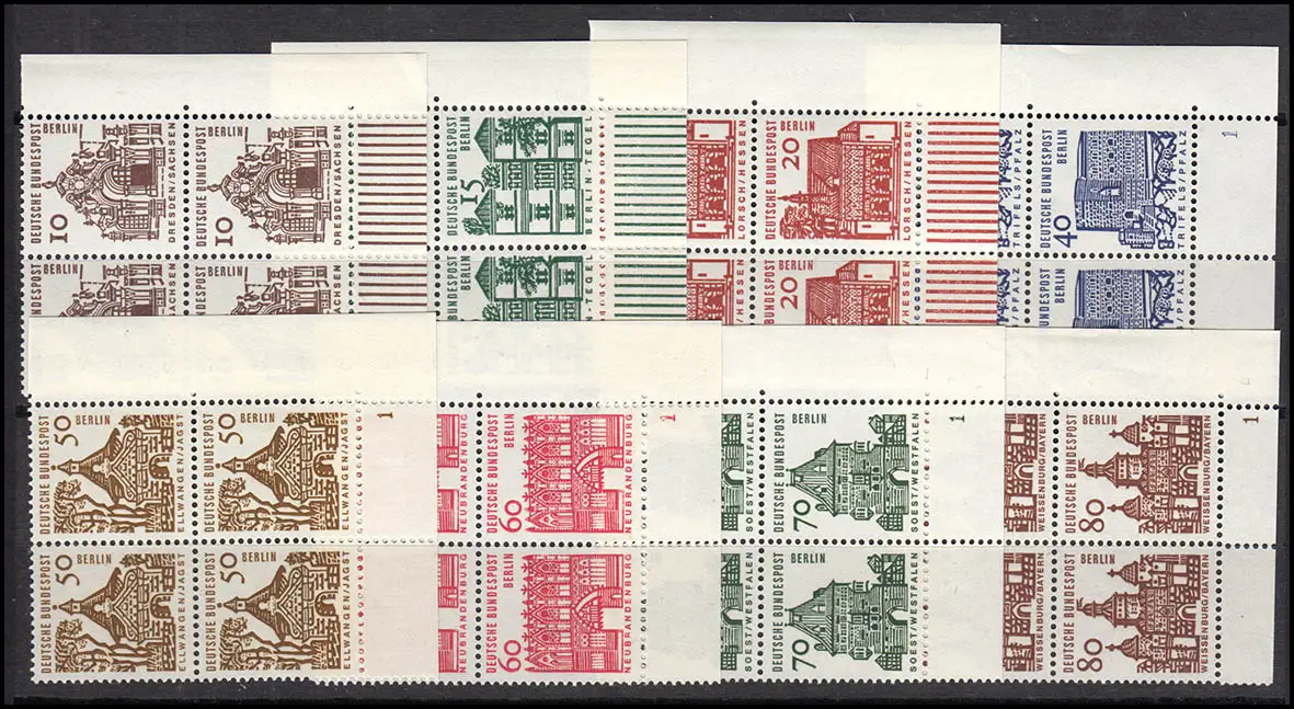 242-249 Bauwerke 8 Werte, Eck-Viererblöcke unten rechts FN1, Satz ** postfrisch