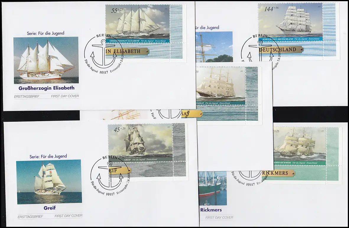 2464-2468 Jugend Großsegler 2005 - Satz als Ecken auf 5 Schmuck-FDC Berlin