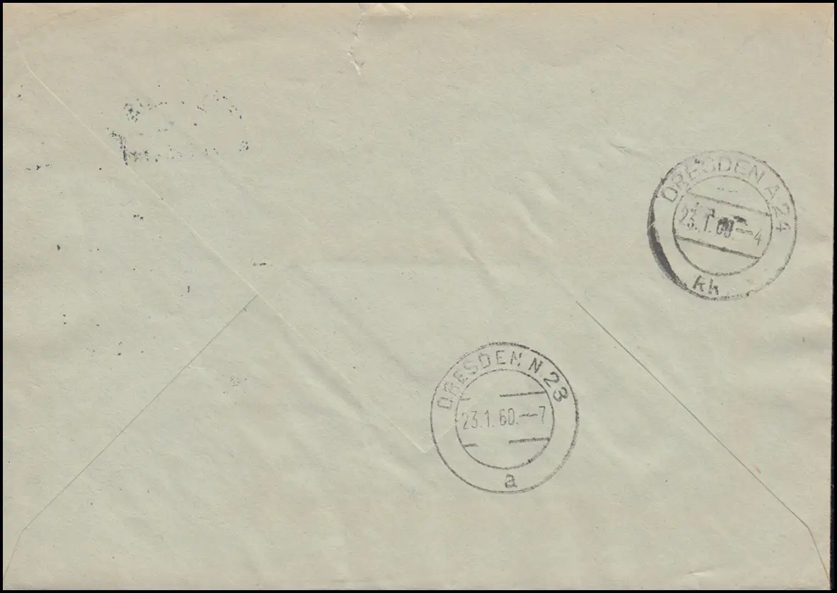 vom Konsum Nahrungsmittelwerk COTTBUS 22.1.60, Fensterbrief, Ankunftsstempel DREDEN A 24 - 31.1.60 und DRESDEN A 23 - 23.1.60