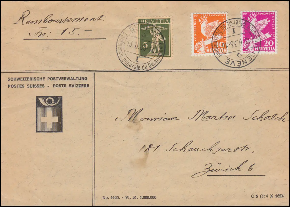 Sonderstempel GENF Abrüstungskonferenz / Conference generale du Desarmement 13.2.33, Ankunftsstempel ZÜRICH OBERSTRASS 15.3.33