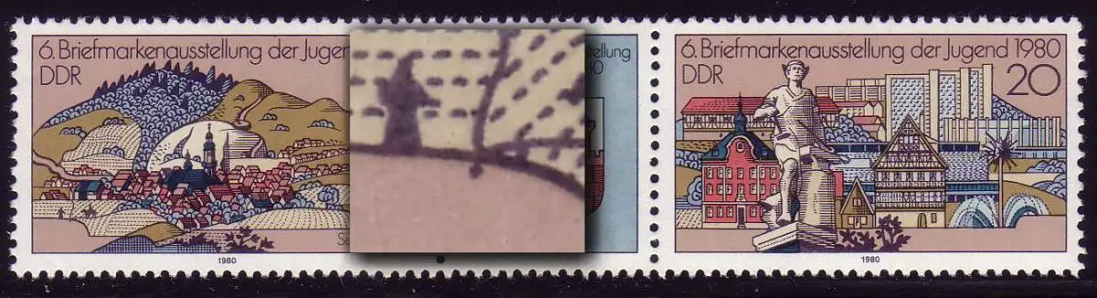 Zusammendruck mit Plattenfehler auf dem 10-Pfennig-Wert [2532]: senkrechter Feldweg unten verlängert