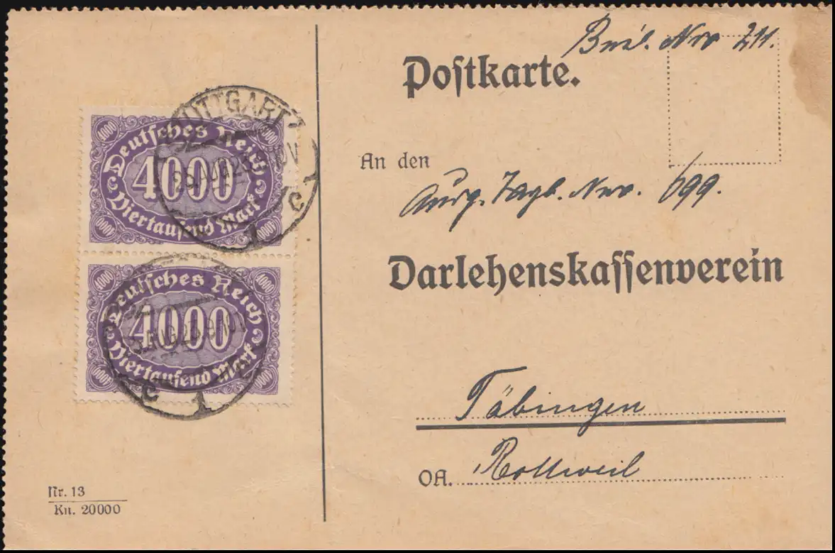 255 Queroffset 4000 Mark MeF auf Fernpostkarte STUTTGART 25.8.23 nach Täbingen