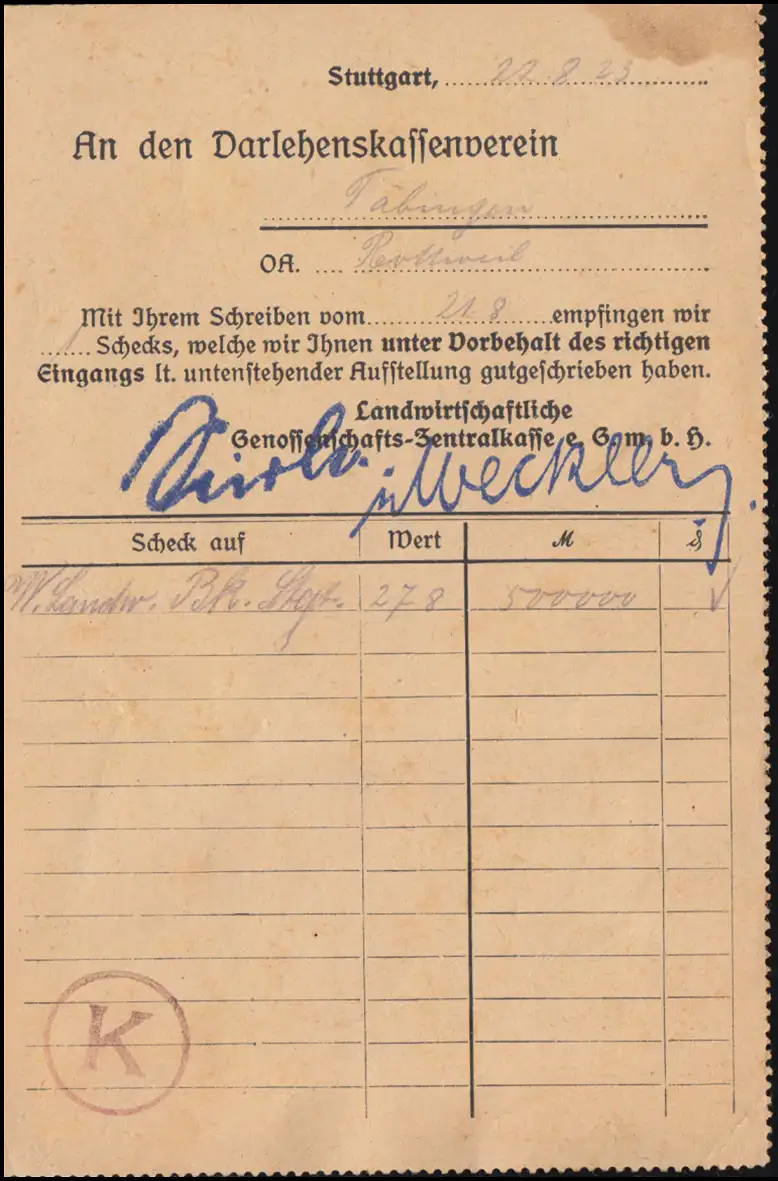 portogerechte Fernpostkarte an den Darlehenskassenverein Täbingen
