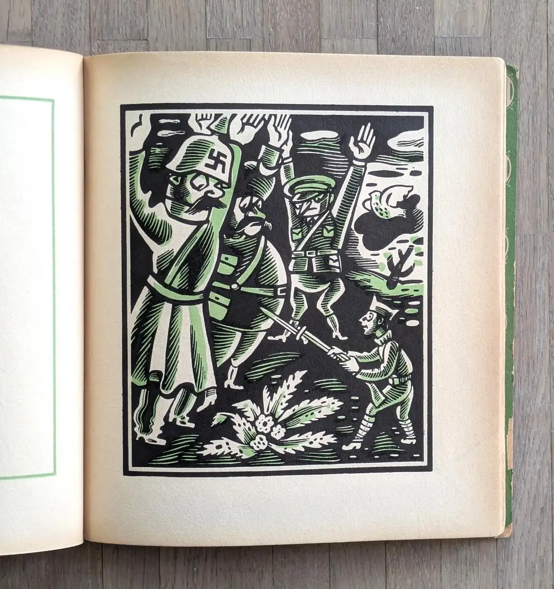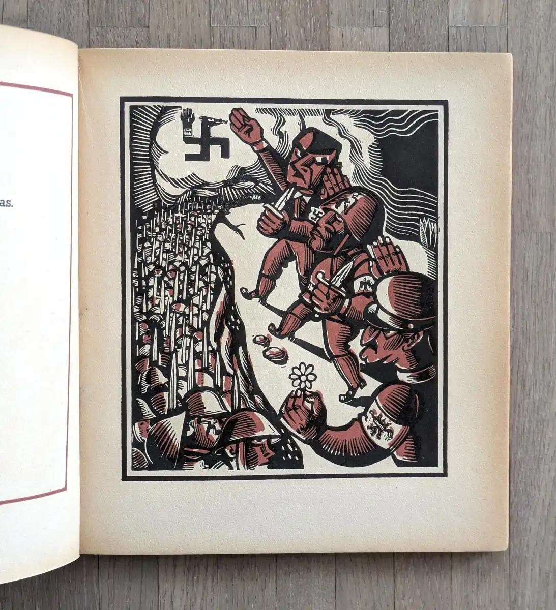 Propagandabuch aus dem spanischen/katalanischen Bürgerkrieg mit deftigen karikaturhaften Holzschnitt-Illustrationen politischen Inhalts.
