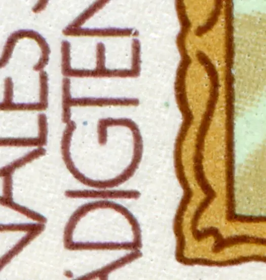Plattenfehler beim 15-Pfennig-Wert: blauer Punkt am 2. G sowie grüner Punkt am Bildrand