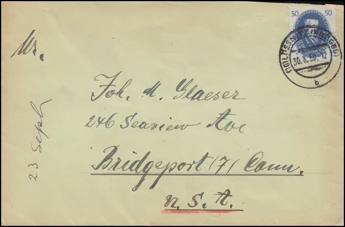 270 Adolf Harnack als EF auf Auslandsbrief LÖSSNITZ (ERZG.) 30.8.1950 in die USA