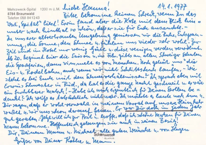 2706 - Schweiz - Glarus , Braunwald , Mehrzweck Spital , Winter - gelaufen 1977