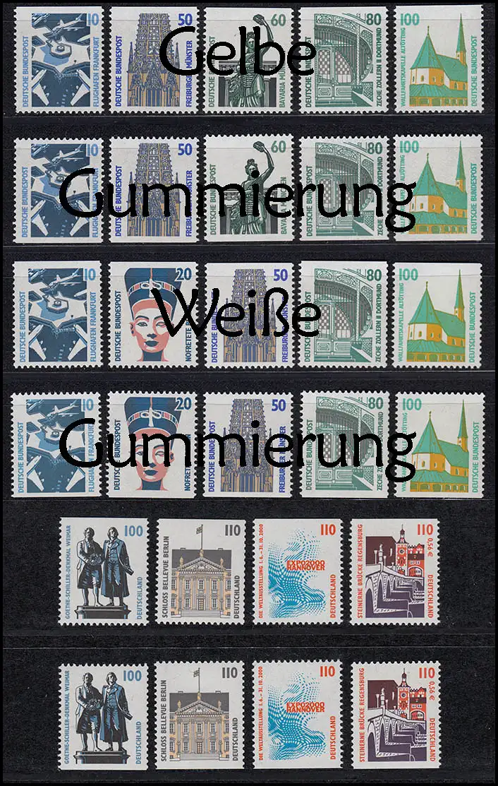 Zusammenstellung mit allen 28 teilgezähnten, nassklebenden Marken aus Markenheftchen komplett wie abgebildet, postfrisch. Dabei finden auch die Gummierungsunterschiede u (gelbliche Gummierung) und v (weiße Gummierung) Berücksichtigung.