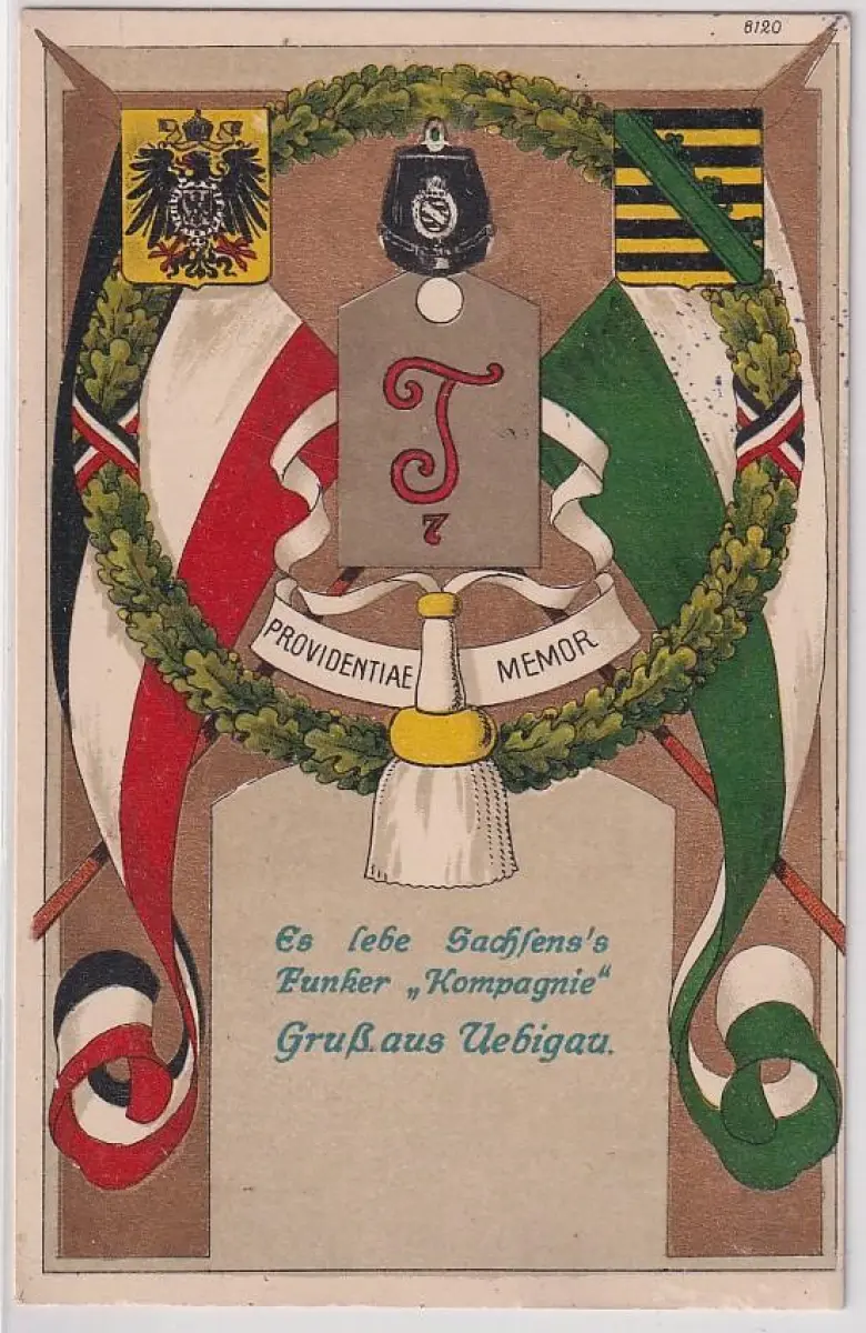 28139 Regiments Ak Lithographie Gruß aus Uebigau es lebe Sachsens Funker Komp.