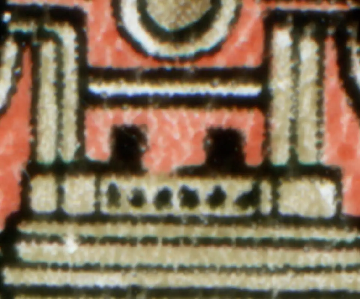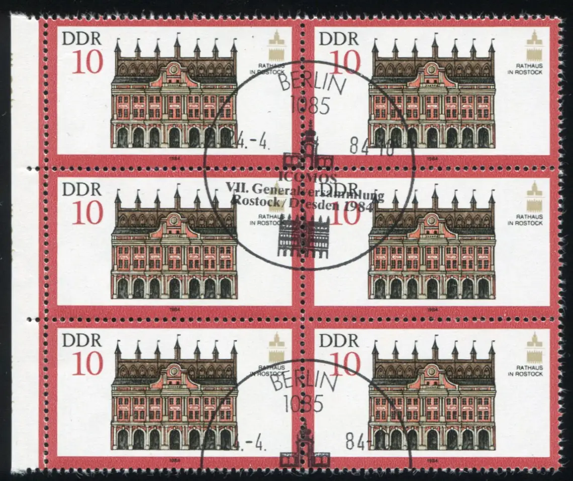 Rand-6er-Block mit zentrischem Ersttagssonderstempel Berlin ICOMOS-Generalversammlung 24.4.1984, Plattenfehler auf Feld 22 (untere rechte Marke): Unterbrechung der schwarzen Einfassungslinie oben im Balkon