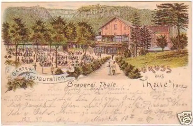schöne farbige Lithographie, Garten Restauration Brauerei Thale, gelaufen mit Bahnpoststempel, gute Erhaltung siehe Bild,