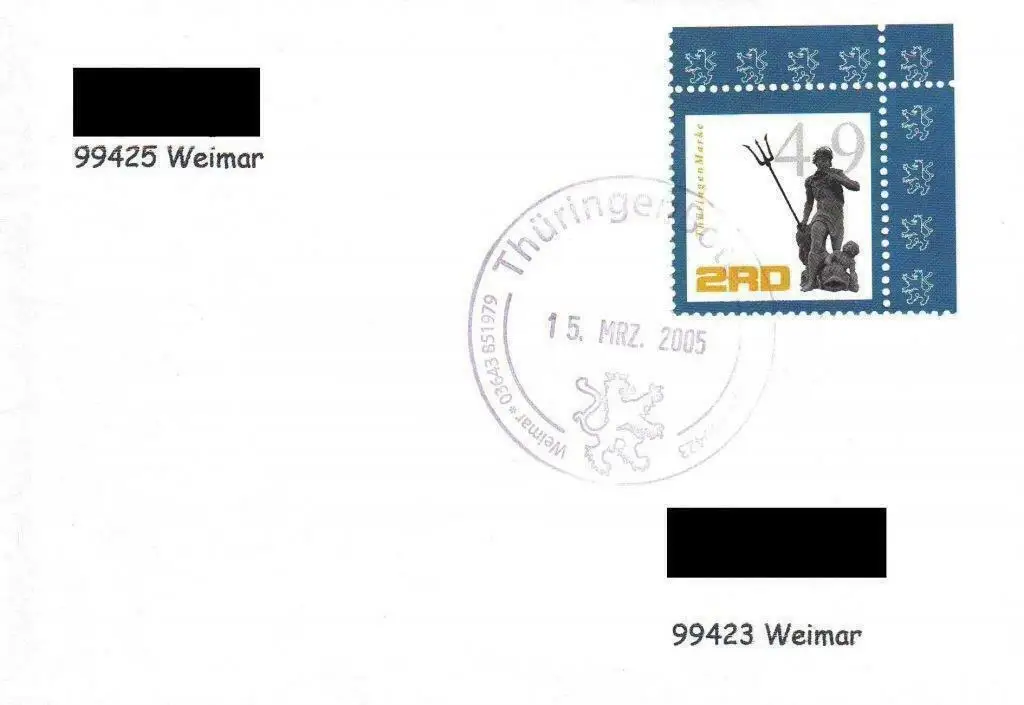 • MichSeite 2RD: MiNr. 1 - 6, 15.12.2004, "Weimarer Denkmale", Satz, Ganzstück (Umschlag) (2) Beschreibung \nAusgabeland: Bundesrepublik Deutschland \nPostdienstleister: 2RD, Weimar \nAusgabeanlass: Briefmarkenausgabe "Weimarer Denkmale" Katalognummer: MiNr. 1 - 6 Ausgabedatum: 15.12.2004 Nominale: Satz (6 Werte, Kleinbogen) zu 0,35 EUR, 0,39 EUR, 0,49 EUR, 0,99 EUR, 1,30 EUR, 1,99 EUR \nTyp: - \nErhaltung: nassklebend, gezähnt, 6 Belege (entwertet mit Handstempel [MiNr. 1, Rechteckkasten, violett und MiNr. 2 - 6, rund, groß, schwarz]) \nHinweis: Abbildung zeigt nur 1 Beleg