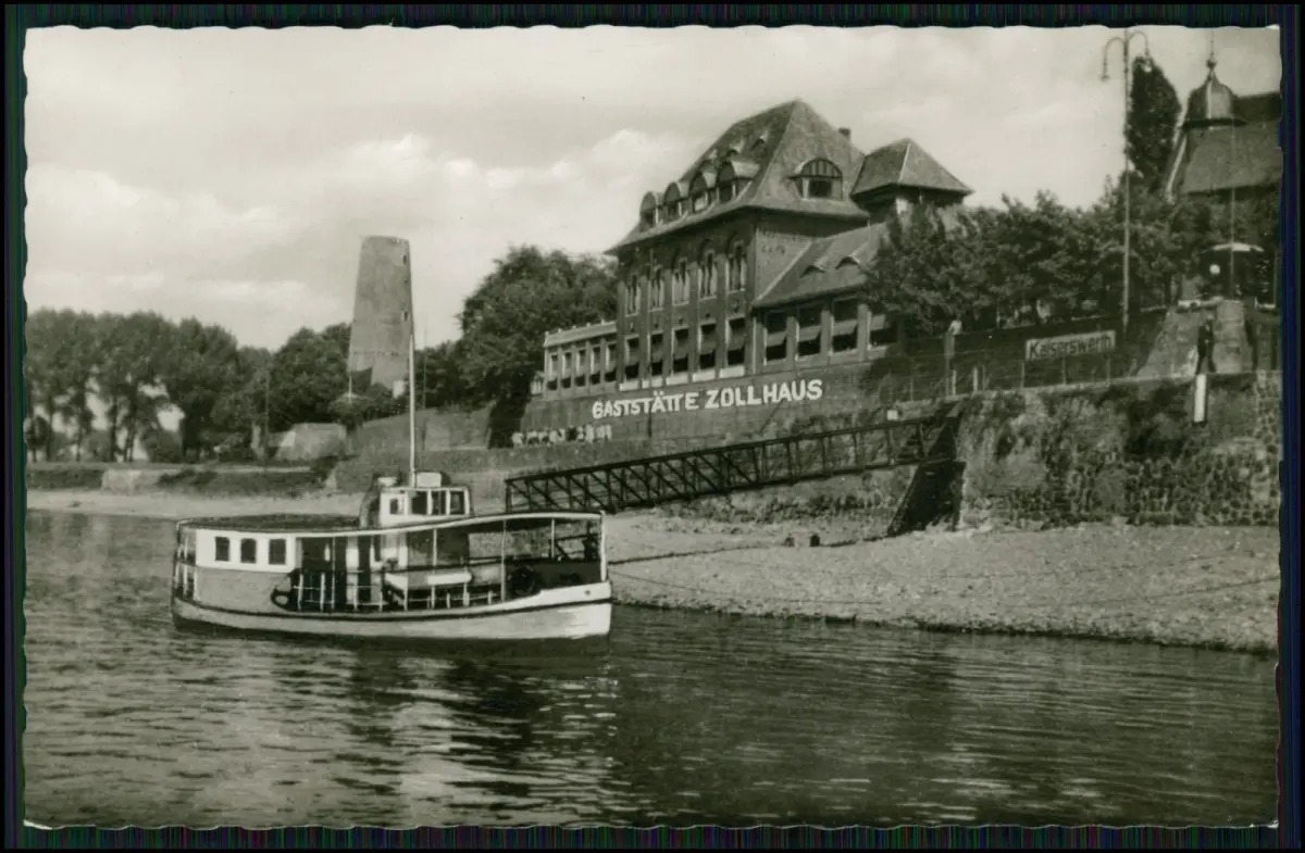 Kaiserswerth am Rhein zeigt hier das Zollhaus mit Dampferanleger und der Kajüte vor dem Ufer.