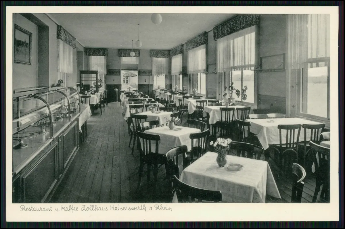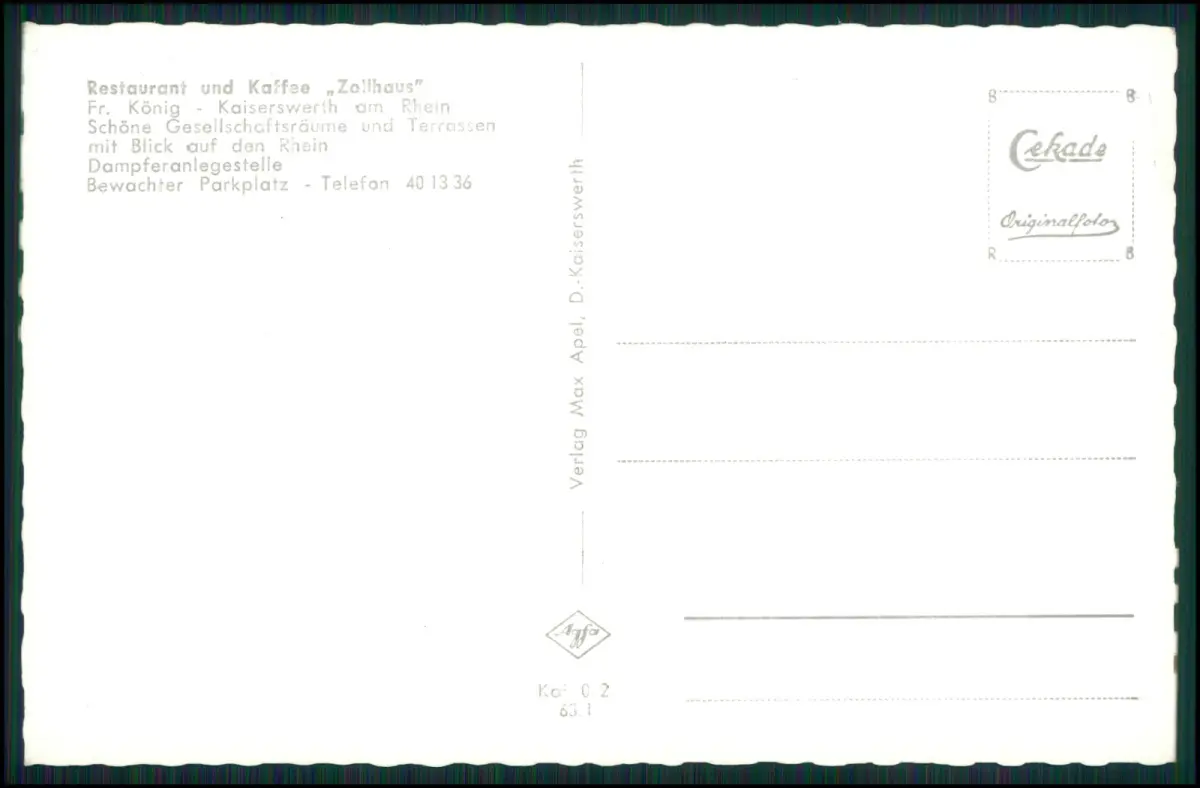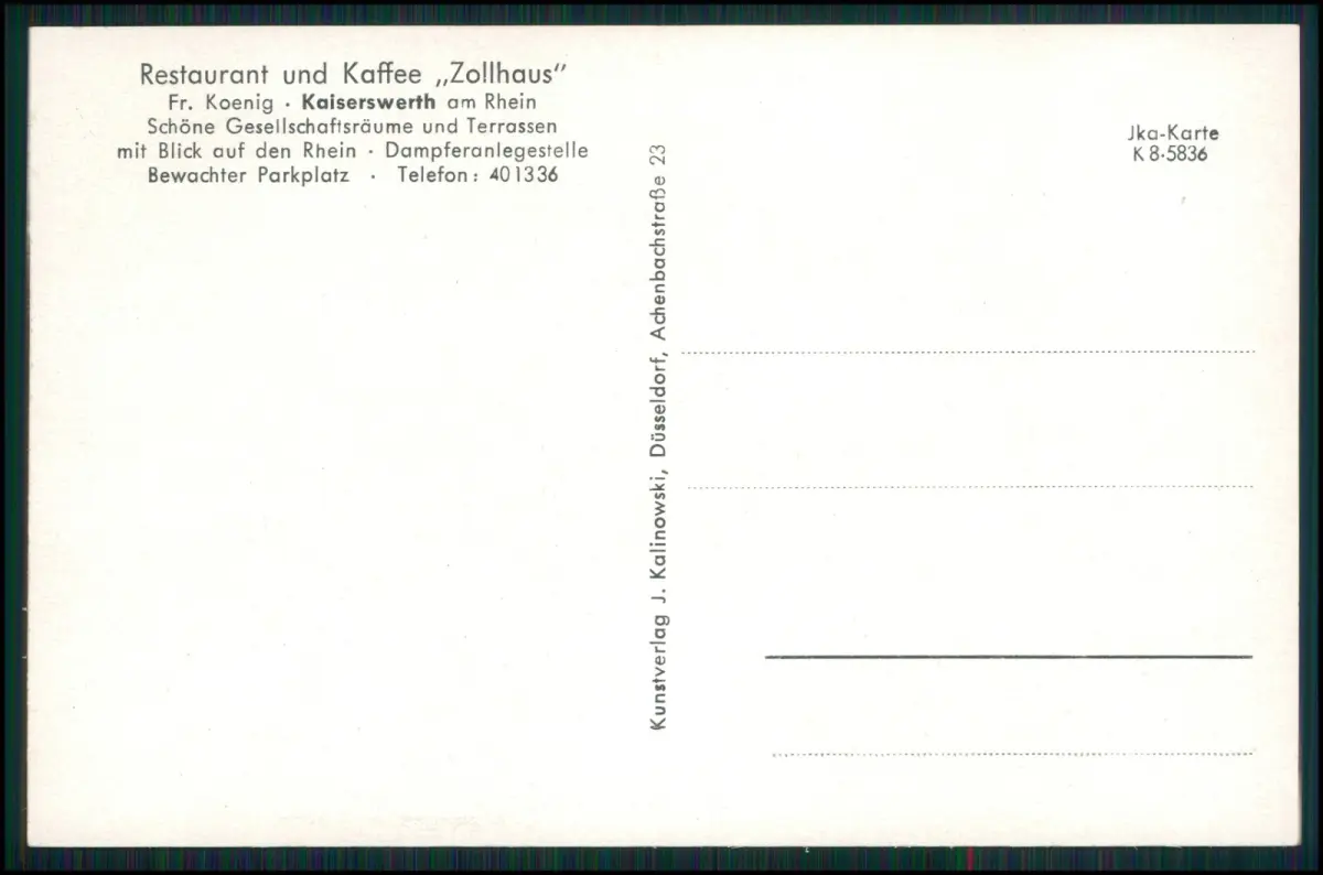 Das zweite Motiv zeigt den Gesellschaftsraum des Restaurant und Kaffee Zollhaus mit klar erkennbarer Einrichtung und typischer Architektur der Zeit. Beide Karten stammen aus dem Verlag Max Apel bzw. J. Kalinowski Düsseldorf und tragen die übliche Verlagskennzeichnung.