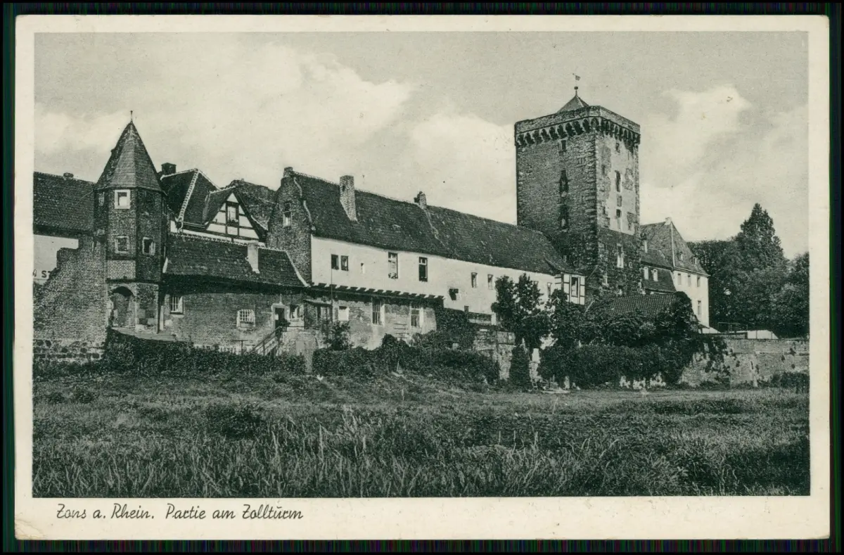 2x Original Postkarte mit Ansicht des Rheintors in Zons am Rhein, einem historischen Ortsteil von Dormagen.