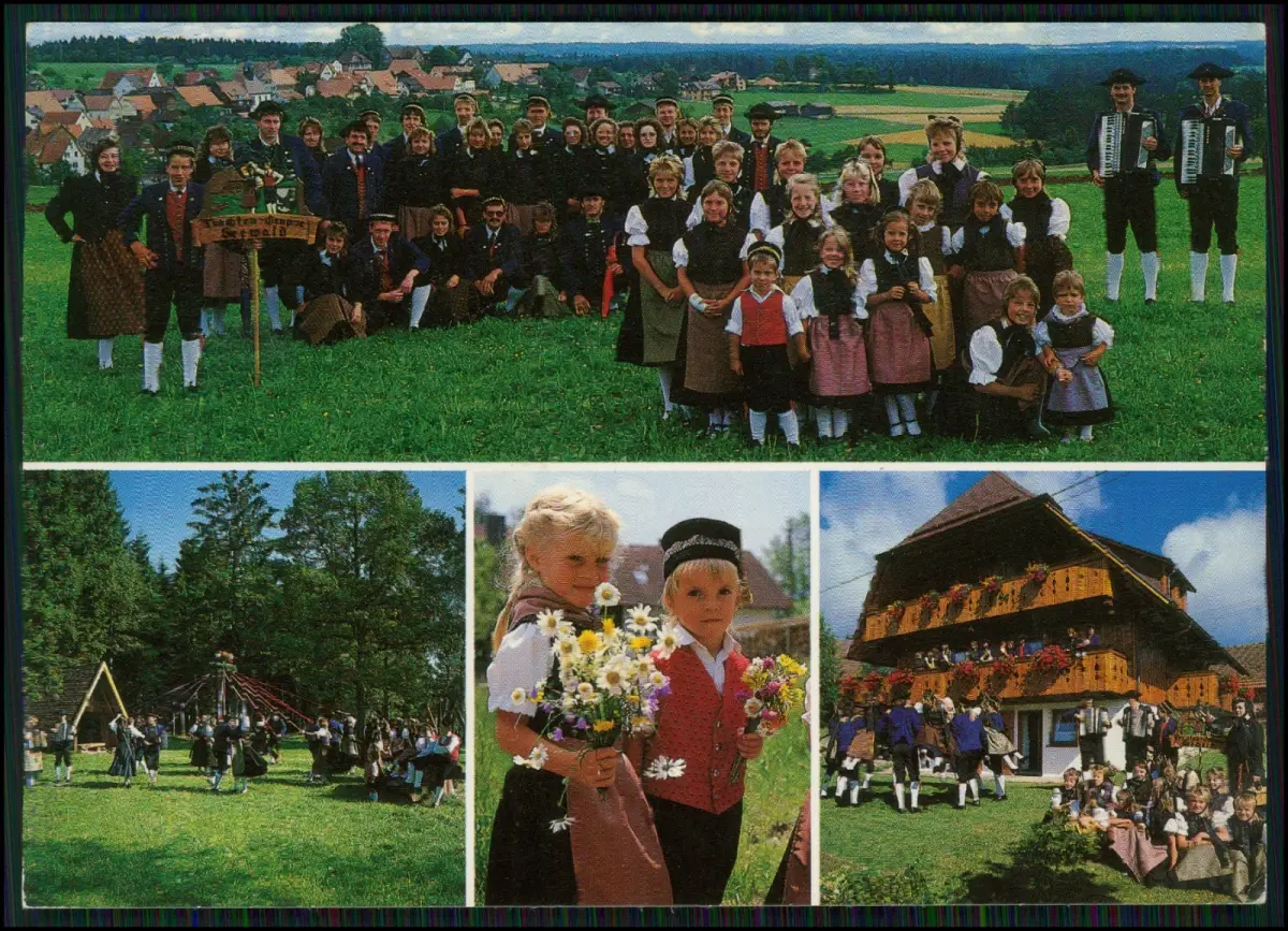 Mehrere Szenen zeigen Kinder und Erwachsene in regionaler Tracht, traditionelle Tanzdarstellungen, Blumenmädchen sowie ein Schwarzwaldhof mit charakteristischen Holzlauben und Blumenschmuck.
