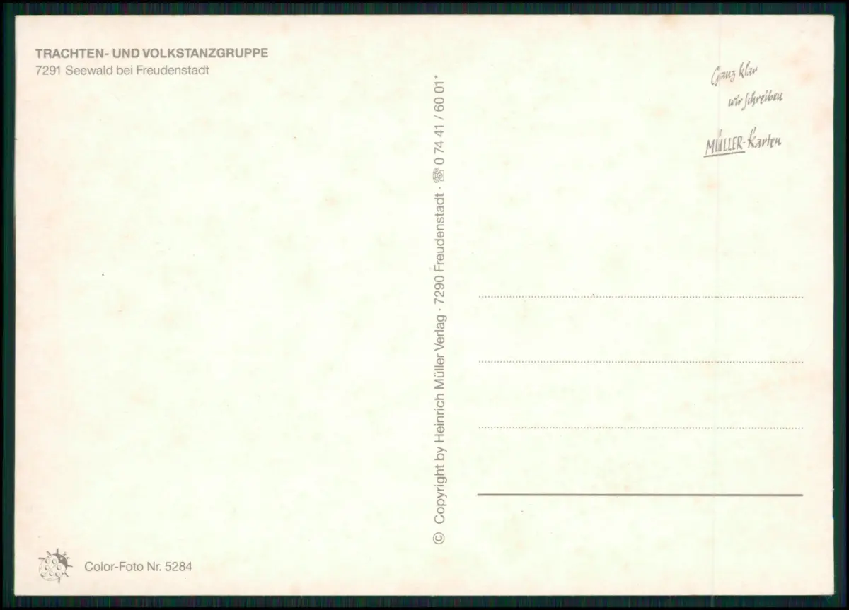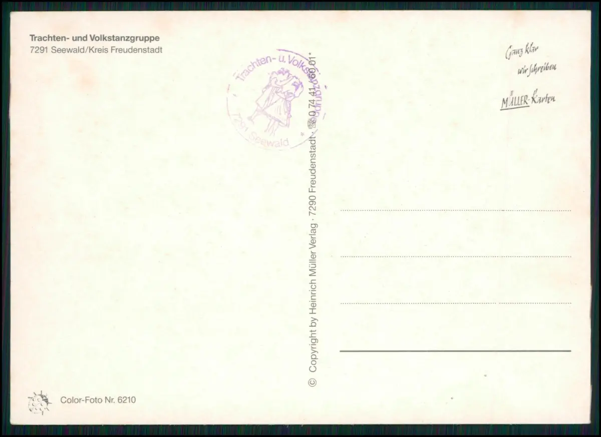 Sauber, unbeschrieben, Stempel der Trachten und Volkstanzgruppe 7291 Seewald, klare Verlagsangaben Heinrich Müller Verlag Freudenstadt, Farbnummern 6210 und 5284.