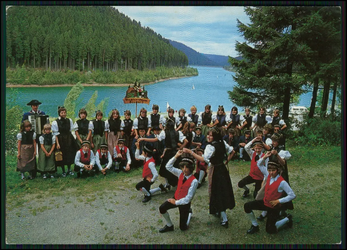 Farbdruckkarte aus Seewald Freudenstadt mit großem Ensemble der Trachten und Volkstanzgruppe im typischen Schwarzwald.