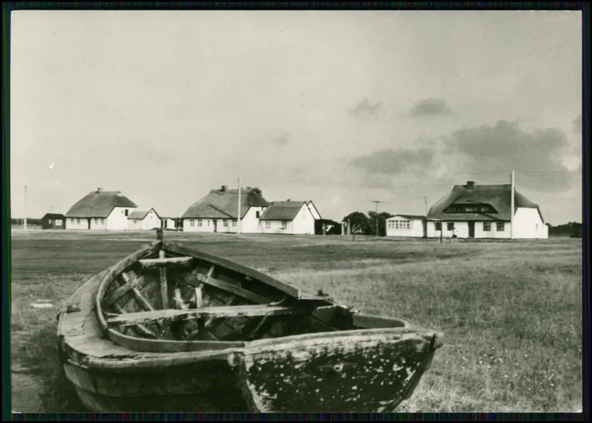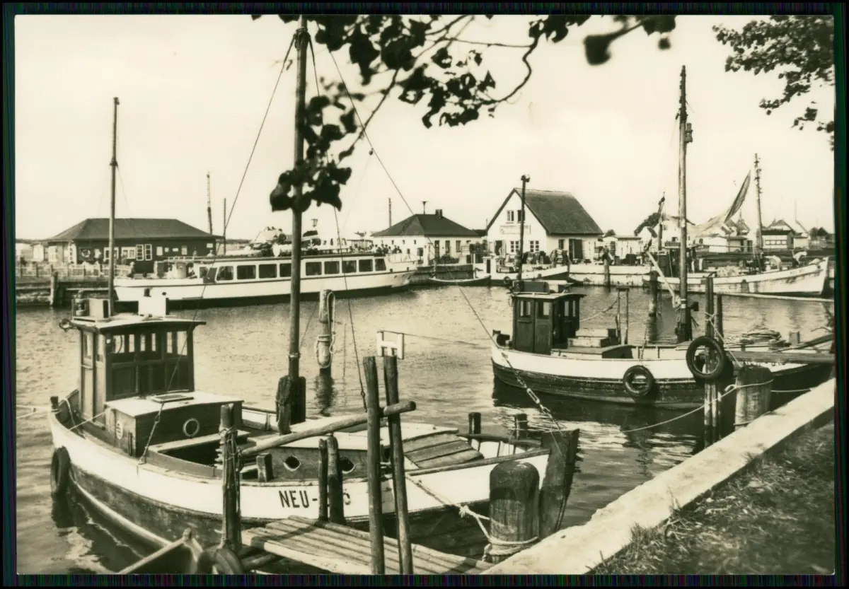 2x Foto AK Neuendorf auf Hiddensee – ruhiger Hafenort im Süden der Insel Hiddensee mit typischen Fischerbooten und Hafenanlage. Auf der Fotografie sind mehrere Boote sowie die Uferbebauung mit Gaststätten und Hafenhäusern der 1970er Jahre zu sehen.