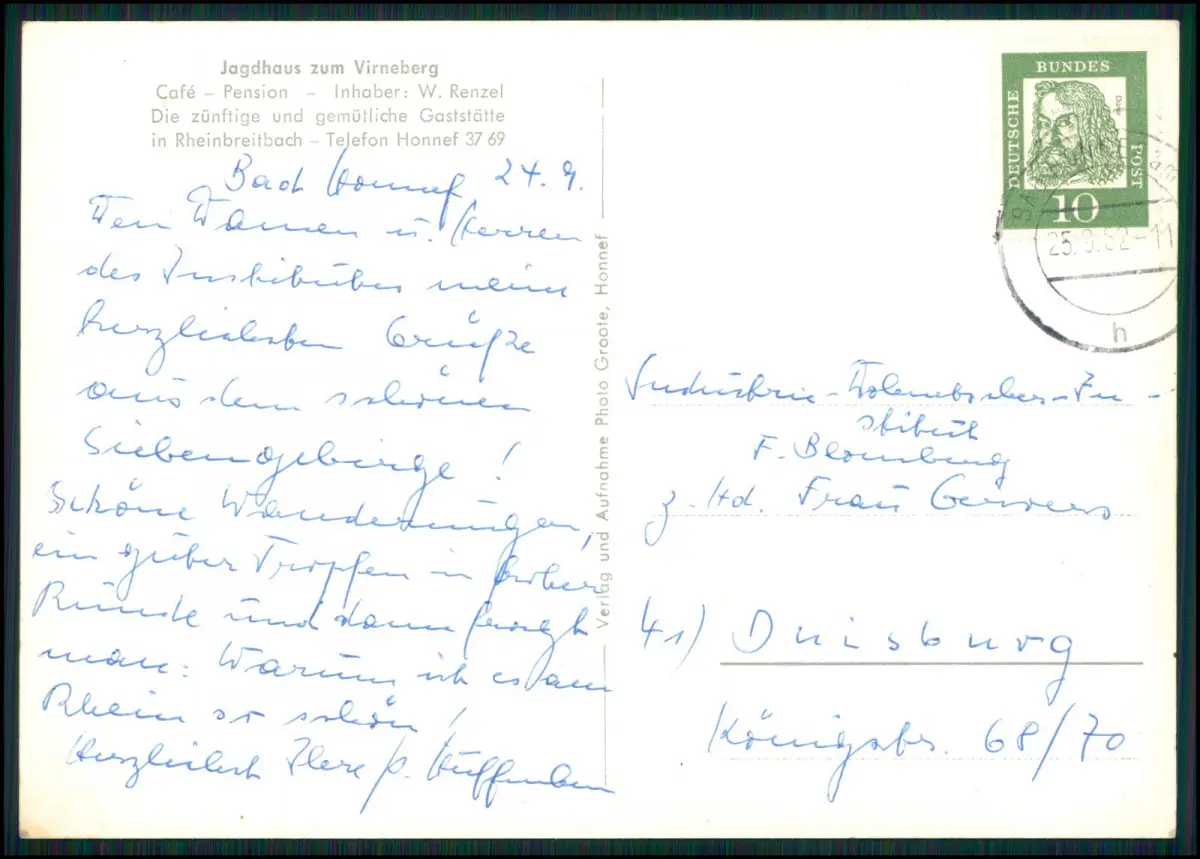 Gelaufen am 25.09.1962, mit 10 Pfennig Deutsche Bundespost (Albrecht Dürer-Marke), gut lesbarer Poststempel. Adressiert an eine Duisburger Einrichtung mit handschriftlichem Text in blauer Tinte. Erwähnung schöner Wanderungen und Weinproben – typischer Urlaubskarteninhalt.