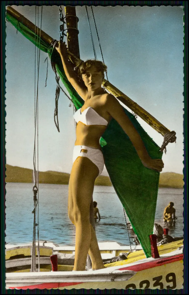 Originale kolorierte Fotoausgabe aus den 1950er Jahren, herausgegeben von Éditions de Luxe G.P. Paris. Zeigt eine junge Frau im Bikini an der Côte d’Azur, Frankreich – typisches Motiv des französischen Sommerlebens der Nachkriegszeit.