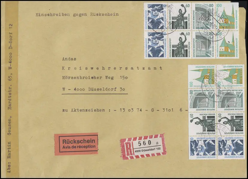 2x Heftchenblatt 31 SWK aus MH 26 MeF R-Brief mit Rückschein DÜSSELDORF 23.6.93