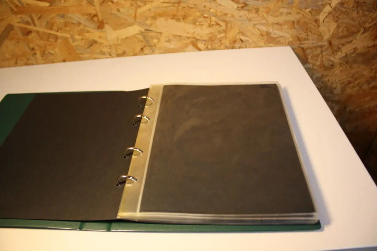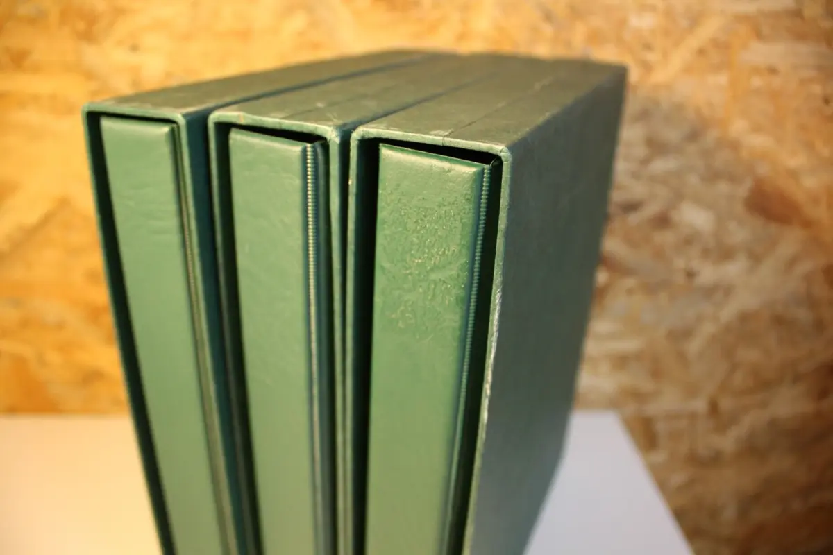 leere gut erhaltene Alben mit Gebrauchsspuren, inkl. Schuber, insgesamt 140 1er Hüllen, Hüllengröße 20,5 x 25cm, Hüllen teilweise meist am Rand verfärbt, 1 Album hat am Rücken Klebereste