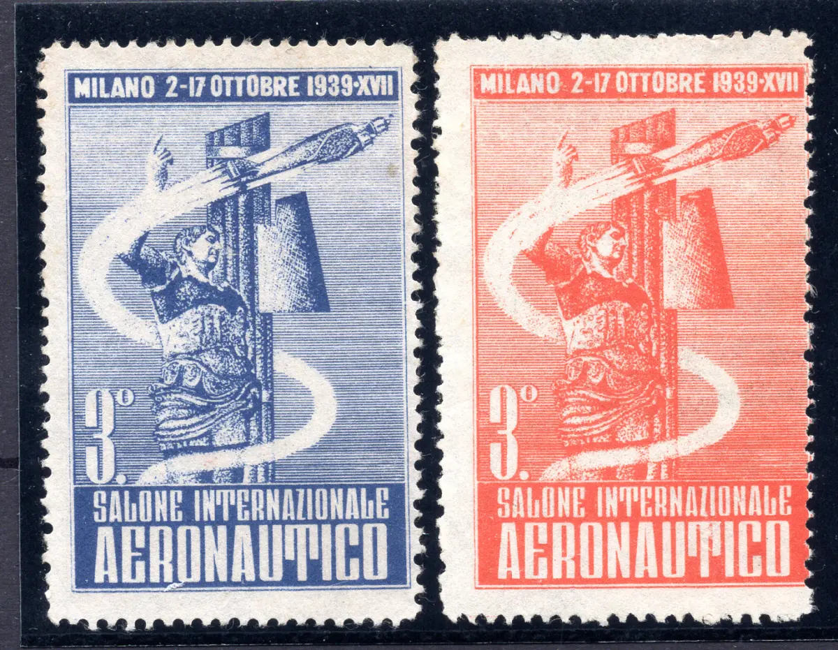 OHNE GUMMI - 3. Salone Aeronautico - Lot von zwei Erinnofili in den Farben Orange und Blau zum Gedenken an den Mailänder Salon im September 1939 Cod.145/182