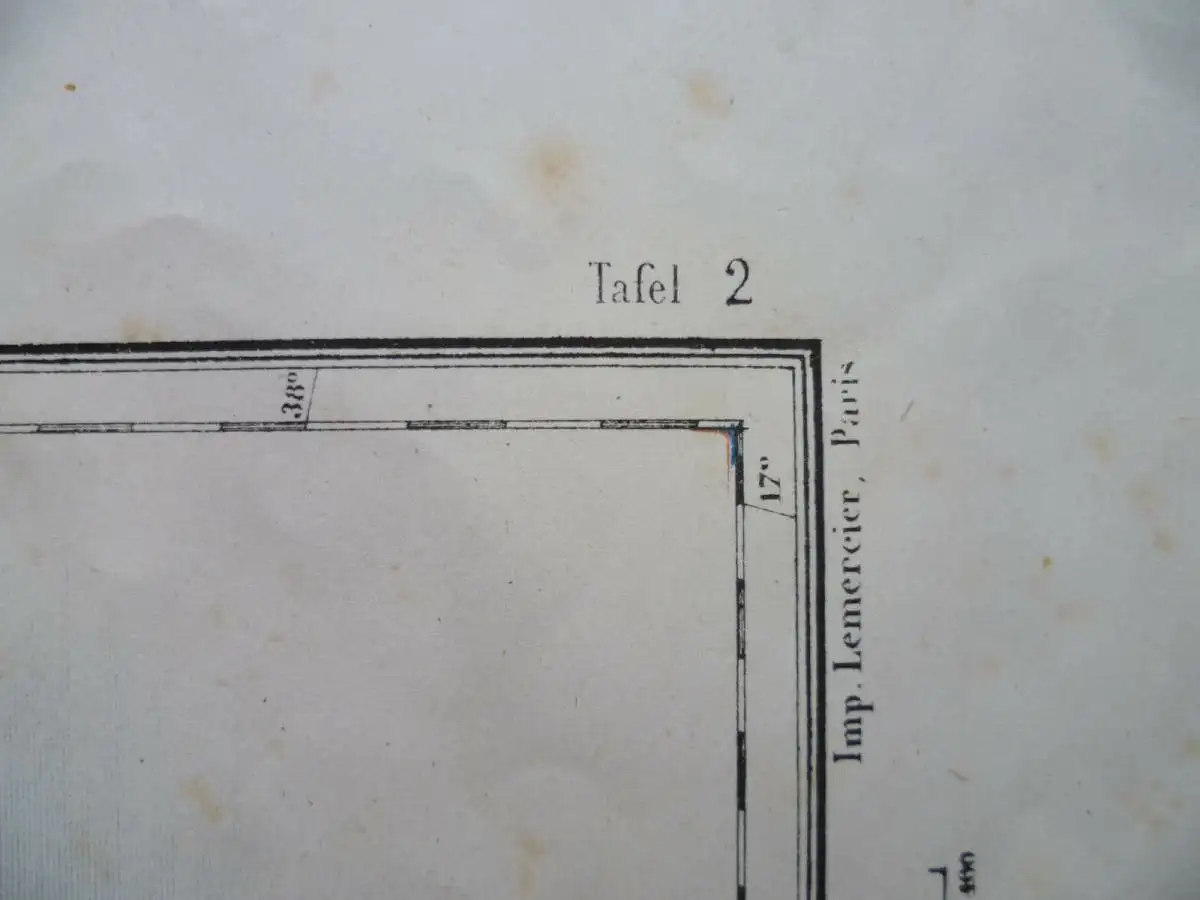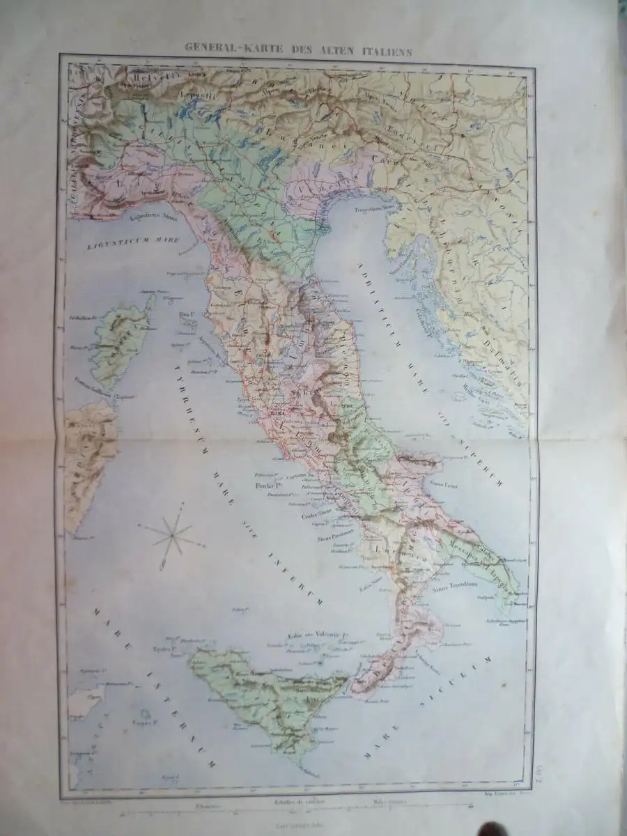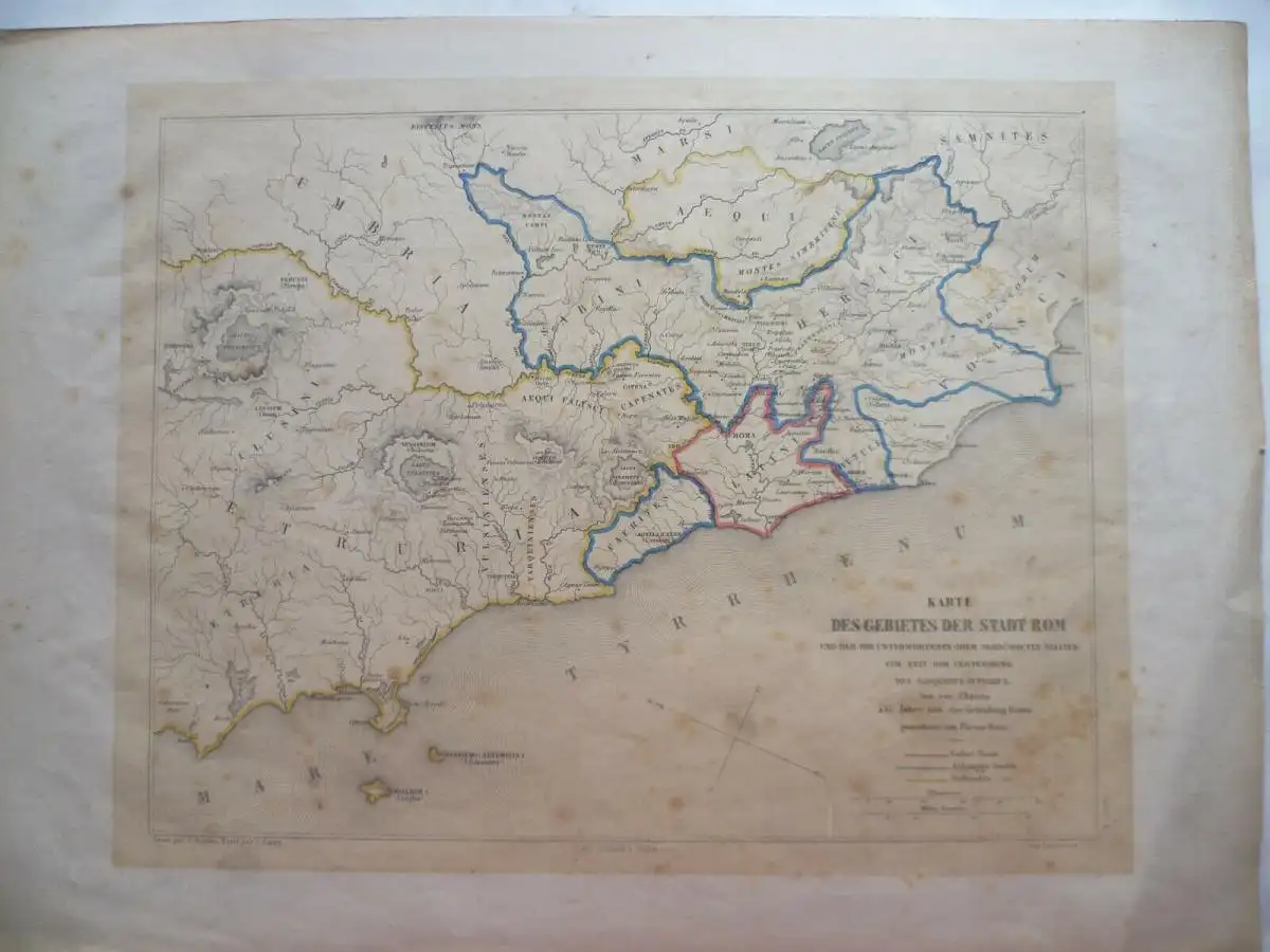 43 großformatige lithographierte Landkarten, Grave par Eduard Schieble, Paris Imp. Lemercier, Verlag Carl Gerold's Sohn Wien, aus einem Buch, bezeichnet als Tafel 1-3. Tafel 1 etwas stärker fleckig, sonst nur vereinzelt gering fleckig und gut erhalten.Tafel 1 Karte des Gebietes der Stadt Rom und der ihr unterworfenen oder verbündeten Staaten zur Zeit der Vertreibung des Tarquinus Suberbus. 23x29cmTafel 2 Generalkarte des alten Italiens. Doppelblatt mit Mittelfalte, 42x27cm.