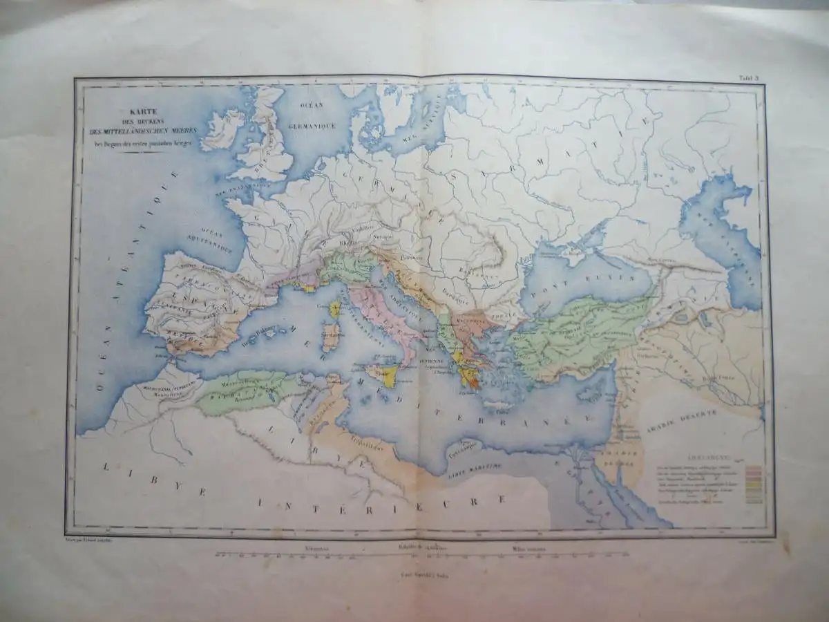 Tafel 3 Karte des Beckens des Mittelländischen Meeres bei Beginn der ersten punischen Kriege. Doppelblatt mit Mittelfalte, 27x42cm.