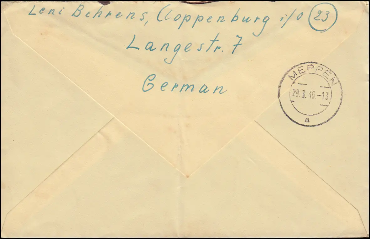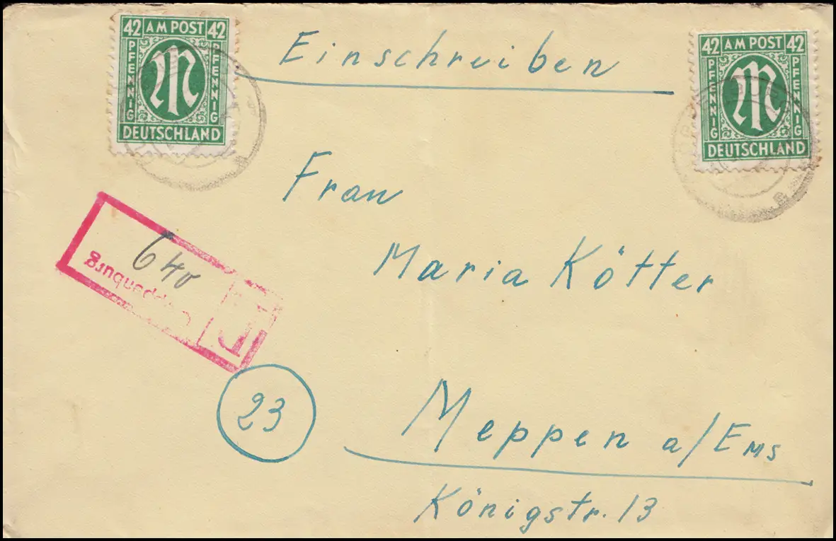 Portogerechte Mehrfachfrankatur auf Fernbrief per Einschhreiben, roter Not-Einschreibe-Stempel Cloppenburg (Nr. 640 kopfstehend eingetragen), Ankunftsstempel Meppen 29.3.46. Umschlag mittig gefaltet und leicht stockig.