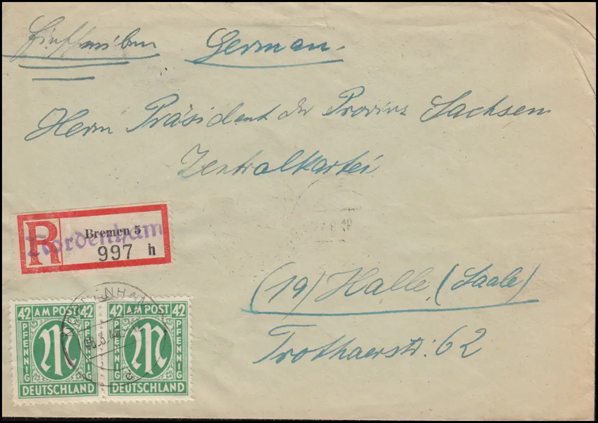 31 AM-Post 42 Pf. MeF R-Brief Not-R-Zettel NORDENHAM 8.6.1946 nach HALLE/SAALE