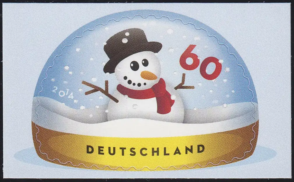 Winter 2014 - Schneemann in Schneekugel, Rückseite weiß, zehn frankaturgültige Briefmarken
