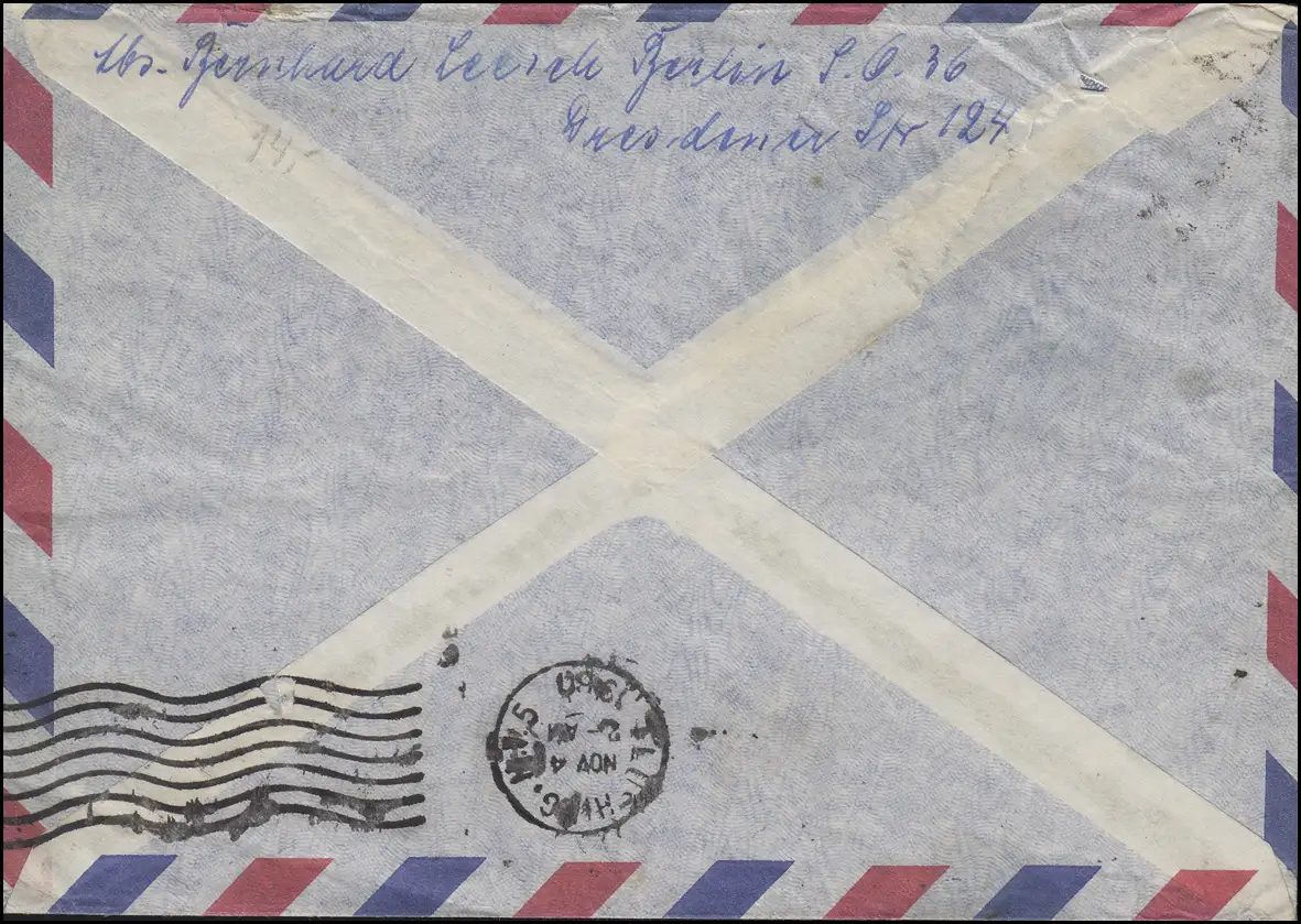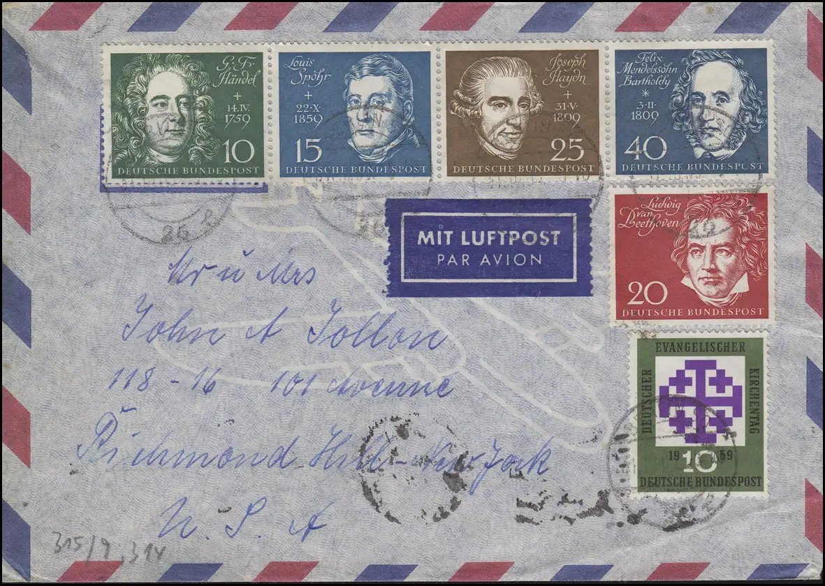 Zusammendruck der 10-15-25-40 Pfennig mit Einzelmarke 20 und Zusatzfrankatur auf Auslands-Luftpostbrief in die USA mit Ankunftsstempel "FLUSHING, N. Y. 5 - 4.11.60"