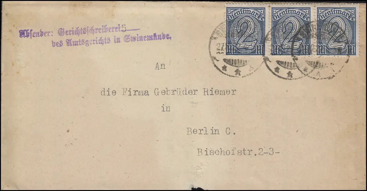 32 Dienstmarke 2 Mark portogerechte MeF Brief Amtsgericht SWINEMÜNDE 27.10.1922