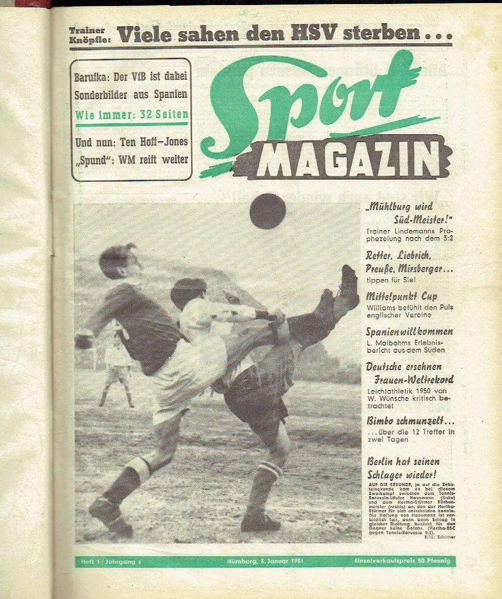 guter Zustand, Gebrauchs- und Alterungsspuren: Hefte waren vor dem Binden mittig senkrecht geknickt worden - gelegentlich kleine Blessuren an den Rändern - Papier teils etwas vergilbt, aber Seiten sauber und ordentlich, sehr selten geringfügig schmutzfleckig - selten ein kleines Eselsohr - Vorderseite von Heft 31 beim Binden unten etwas mit der Seite zuvor verklebt und gering gerissen - Einbandecken gering defekt, Sie bekommen folgende Ausgaben der Sport-Zeitung (überwiegend Fussball, aber auch andere Sportarten und Veranstaltungen), in einem Buch gebunden, geliefert: - Sport-Magazin 1951: 1, 2, 4, 5, 7, 10-12, 14-17, 20-27, 29, 31, Halbleinen, ca. 24 x 32, je 24 bis 32 Seiten mit zahlreichen Bildern (= ca. 624 Seiten)
