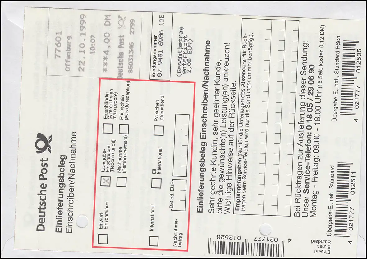 3.2 Posthörner 110 auf EPOS-Übergabe-Einschr. 400 Pf ET-O Offenburg 22.10.99